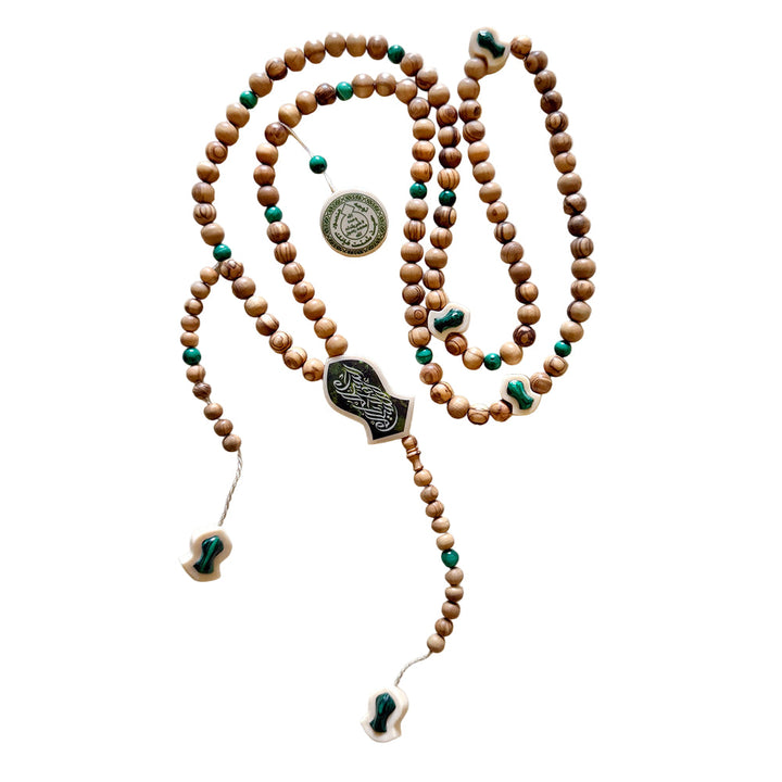 سبحة 100 حباية 8 ملى من الأخشاب الطبيعية خشب الزيتون الطبيعى من شجر الزيتون المباركه مع حبات الملاكيت الطبيعى مع طقم العاج تسقيط ملاكيت وسنتر بيس النعل الشريف طباعة السلام يا اهل السلام عداد جانبى ختم النبوة وعداد رأسى