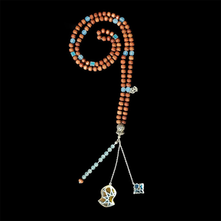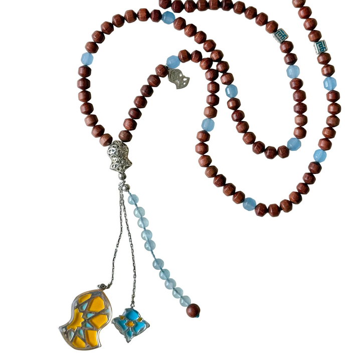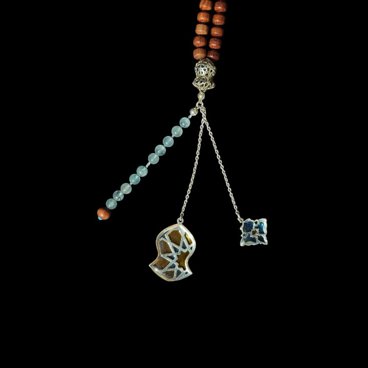 سبحه ٩٩ حبه من خشب الورد والاكوا مارين في فضه عيار 925
