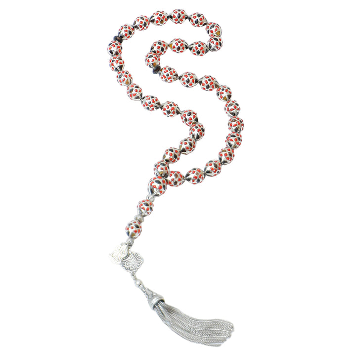 تتميز هذه السبحة بـ33 حبة مصنوعة من شاسيه فضة مطعم بمرجان ويسر، مما يمنحها مظهراً أنيقاً وفريداً. تصميمها المتقن يعكس جودة عالية ويضفي لمسة تقليدية راقية، مناسبة للاستخدام اليومي أو كهدية مميزة. تجمع بين الجمال والقيمة الروحية، مما يجعلها خياراً مثالياً لعشاق التحف الإسلامية.
