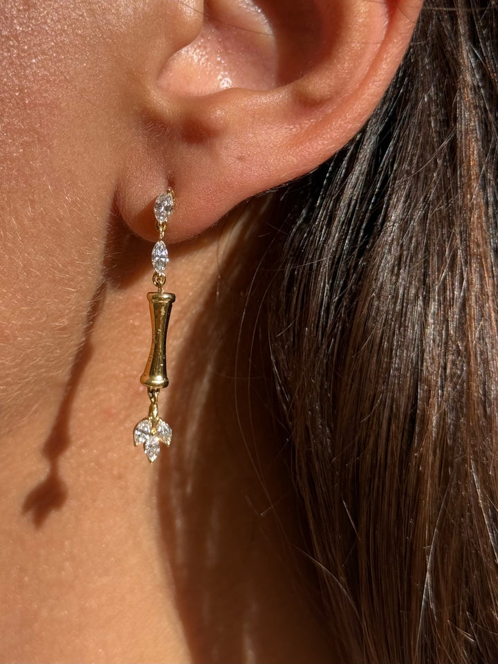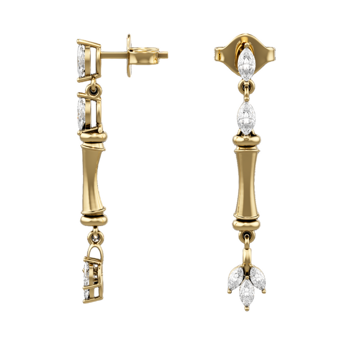 This sculptural design features a bamboo-inspired ring crafted in luminous 18K yellow gold, suspended by two marquise-cut diamond leaves. A trio of marquise diamonds delicately dangles below, catching the light with every movement — a graceful emblem of growth and fortune.