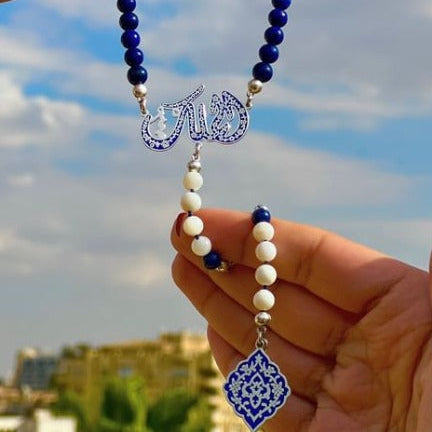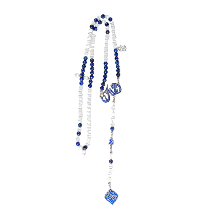This seashell and lapis rosary with silver is expertly crafted with natural seashells and deep blue lapis beads, connected by a durable silver chain. Enhance your prayer experience with the calming oceanic essence of the seashells and the grounding energy of the lapis beads.